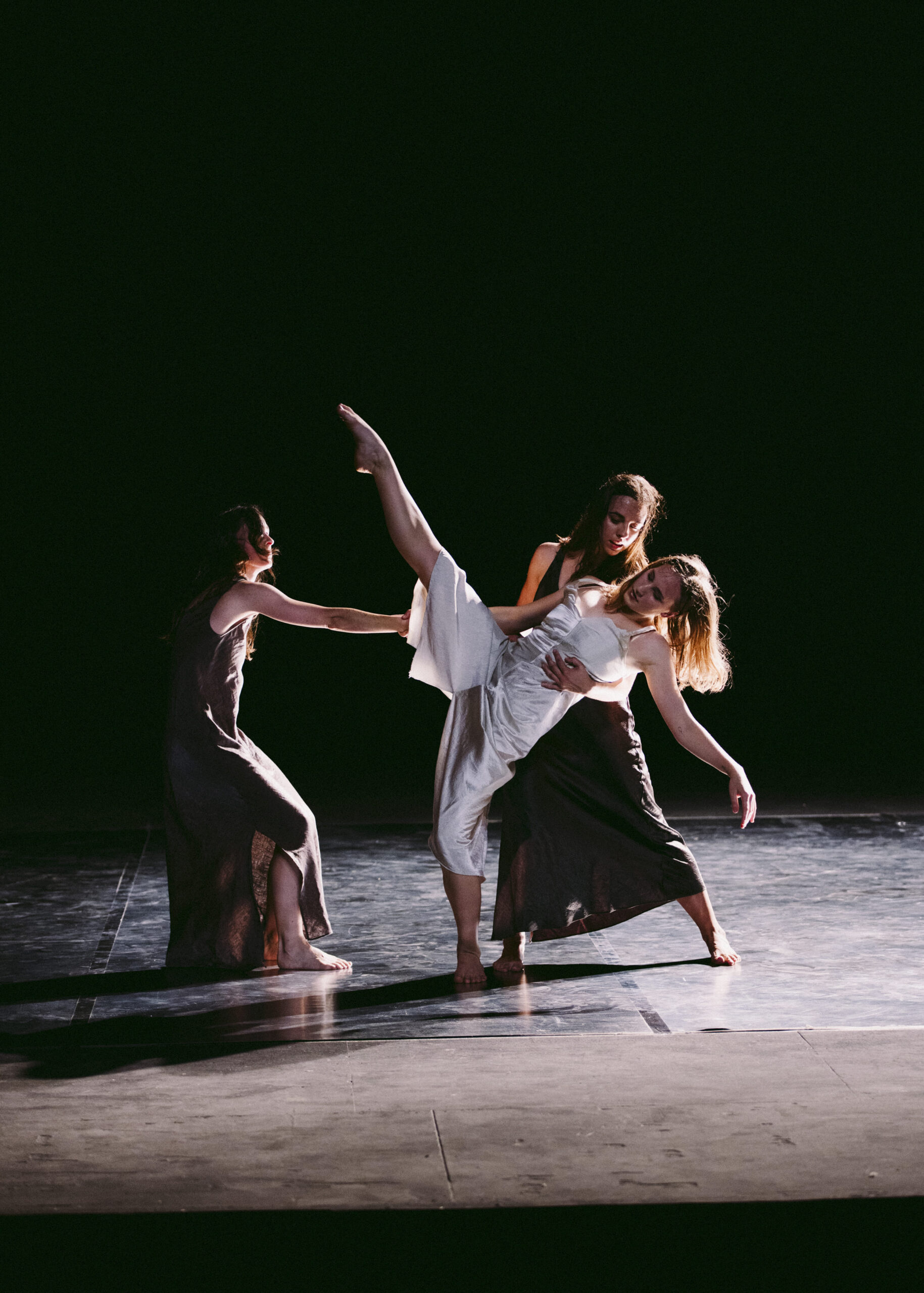 La obra, inspirada en la nocturnidad y el misterio de los bosques, aborda lo femenino desde una fusión de danza clásica y contemporánea. La coreografía interpretada por tres magníficas bailarinas evoca una energía espiritual y telúrica, conectando con el espectador de forma íntima y simbólica. Es una propuesta enigmática, pero clara en su comunicación, que trasciende la escena y deja una fuerte impresión emocional.
